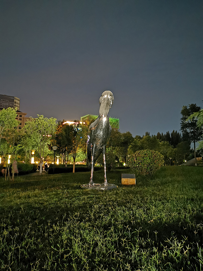 《鯨頭鸛》用水紋燈映亮雕塑周圍環境,以彩色小型投光燈對雕塑局部染色,一副艷麗的鯨頭鸛在河邊休憩的場景便映入眼簾。