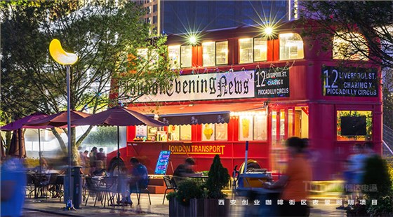 西安創(chuàng)業(yè)咖啡街區(qū)是西部的投資熱土和創(chuàng)業(yè)天堂,為打造創(chuàng)新創(chuàng)業(yè)新地標(biāo),信達(dá)電通通過明與暗、動(dòng)與靜、冷與暖、光與影的對(duì)比,為西安創(chuàng)業(yè)咖啡街區(qū)夜景提升設(shè)計(jì)創(chuàng)造出具有層次感的燈光環(huán)境。周圍建筑與景觀改造形成統(tǒng)一步調(diào),咖啡杯、水滴景觀、咖啡豆等景觀裝置和雙層咖啡巴士的創(chuàng)新設(shè)計(jì)提升咖啡街區(qū)的趣味性和藝術(shù)性,打造年輕、時(shí)尚、有活力的空間,形成西安新地標(biāo)。