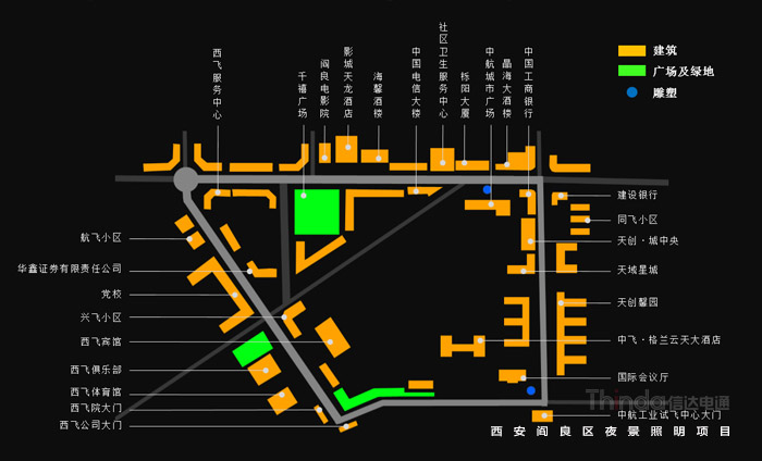 閻良區(qū)位于西安東北部,不但是一座底蘊(yùn)深厚的歷史古城,還是一座資源豐富的航空名城,區(qū)內(nèi)有中航工業(yè)試飛中心、第一飛機(jī)設(shè)計(jì)研究院、西飛公司、中國飛機(jī)強(qiáng)度研究所等大型航空企事業(yè)單位,聚集了1/3以上的航空資源。閻良已成為中國唯一、亞洲最大的六位一體的航空工業(yè)基地,被譽(yù)為“中國航空城”。本案亮化設(shè)計(jì)范圍為閻良區(qū)人民東路、西飛大道、試飛院路、公園南街等四條道路兩側(cè)的30余棟建筑及廣場、景觀帶。