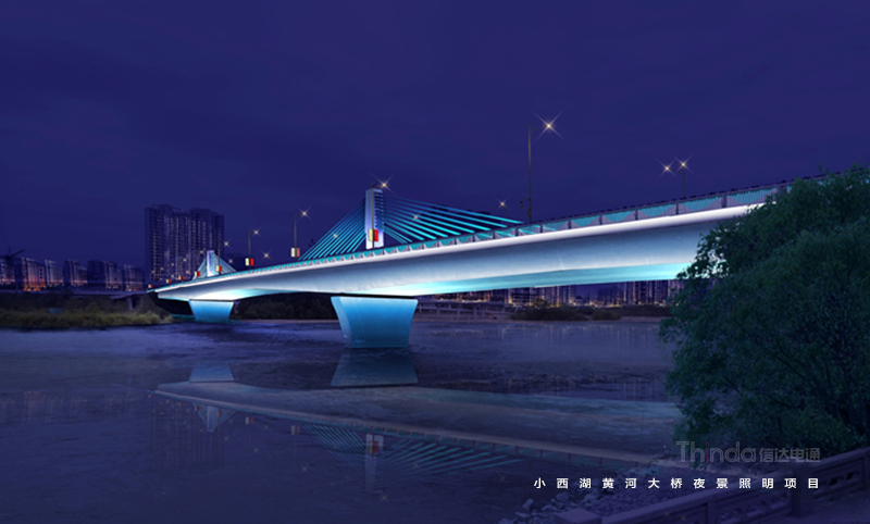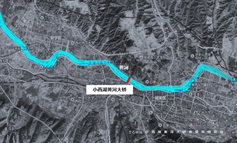 小西湖黃河大橋位于蘭州市七里河區濱河路黃河風情線中段,夜景提升前,大橋燈具脫落、管線外露,影響大橋形象。照明設計中,信達采用藍、白等至純純之色,體現橋體的晶瑩剔透,純凈如水,晶瑩如露。