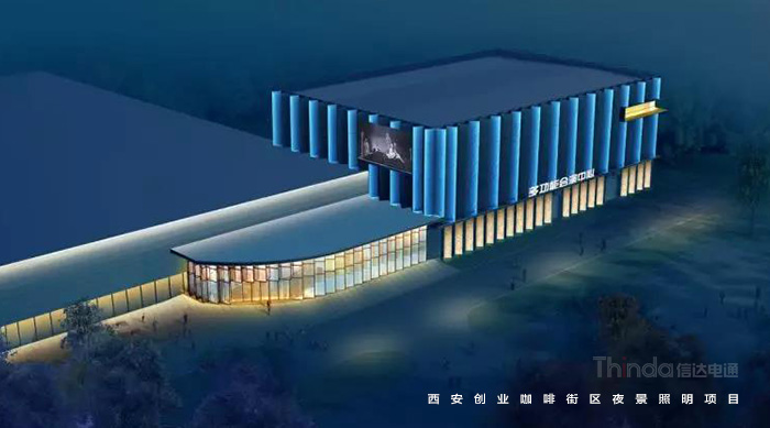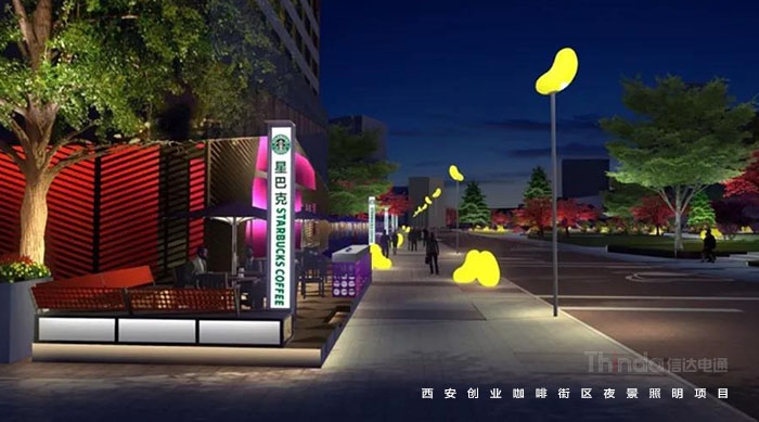 信達電通在2017年完成了眾多大型城市亮化項目,其中濃墨重彩的一筆當屬西安創業咖啡街區的亮化。